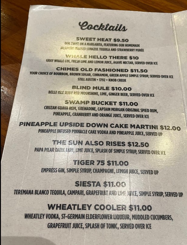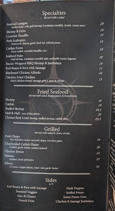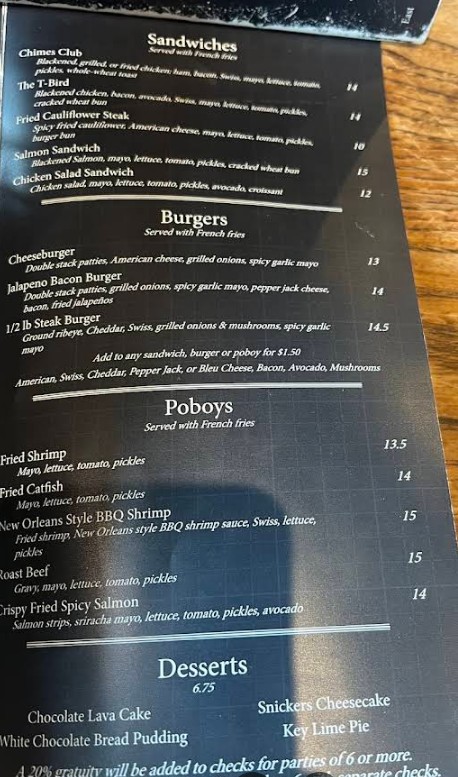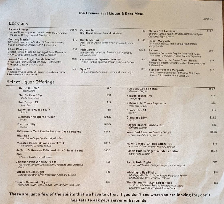 We find The Chimes East is a great combination of a fun and casual atmosphere and good dining. The atmosphere is lively without being too loud. We found the food is good, with a fairly extensive menu. My salmon was cooked perfectly. The staff are friendly and attentive and the table spacing is comfortable.
